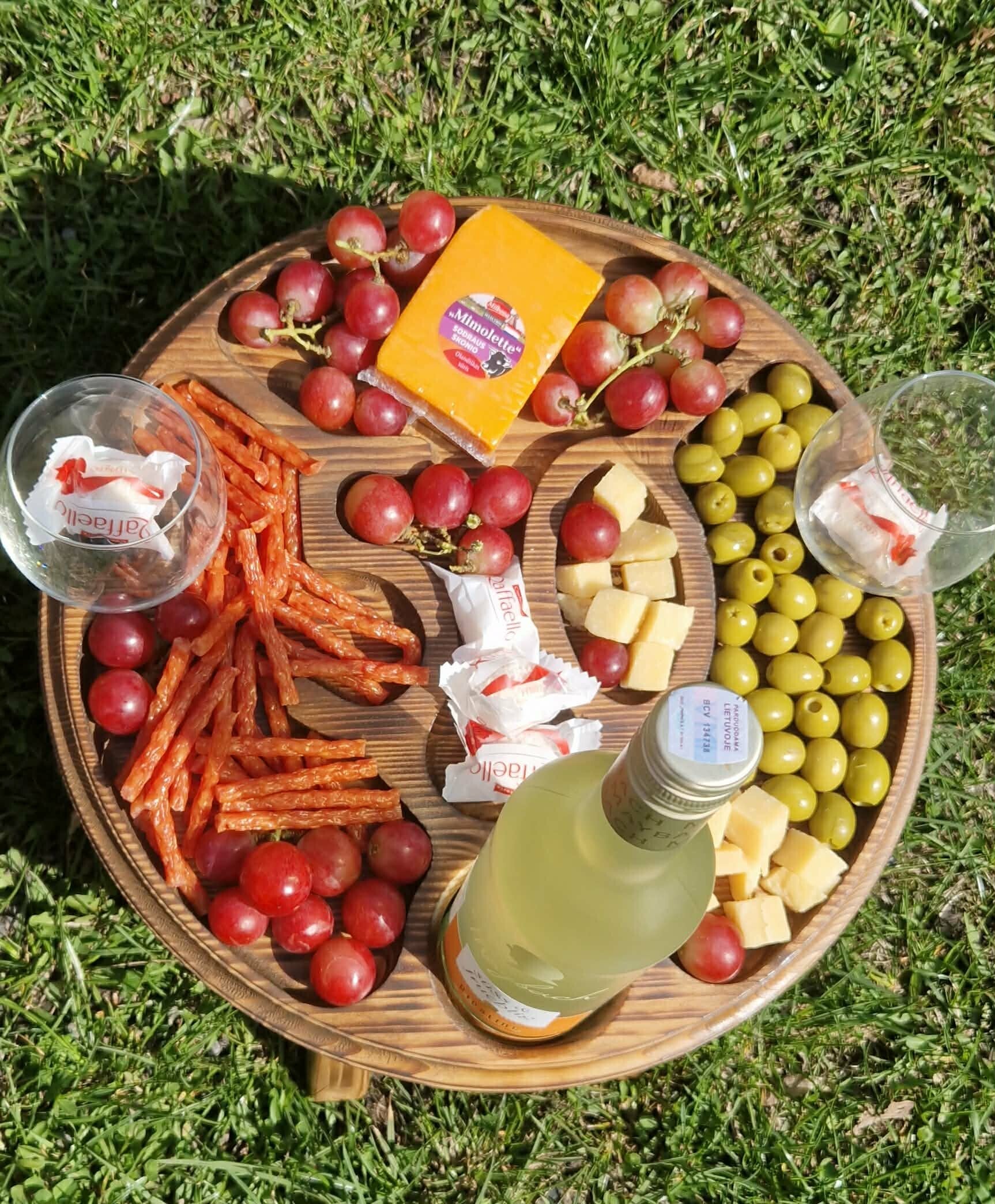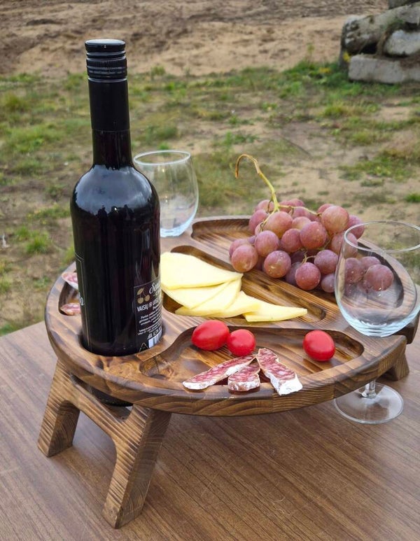 Rankų darbo medinis staliukas su vyno laikikliu – praktiškas, stilingas ir sukurtas mėgautis akimirkomis.