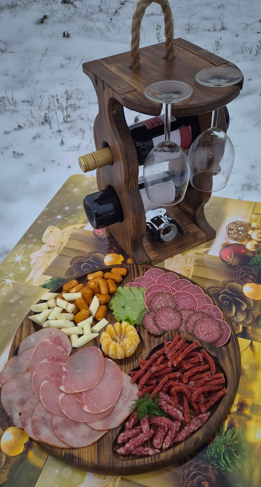 Stilingas rankų darbo 2 vyno buteliu laikiklis su vieta atidarituvui ir 2 taurėms.
